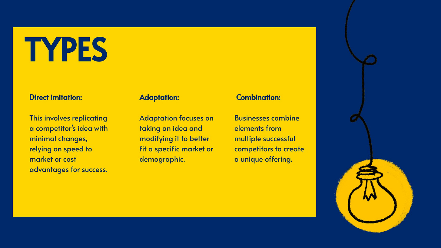 This involves replicating a competitor’s idea with minimal changes, relying on speed to market or cost advantages for success.